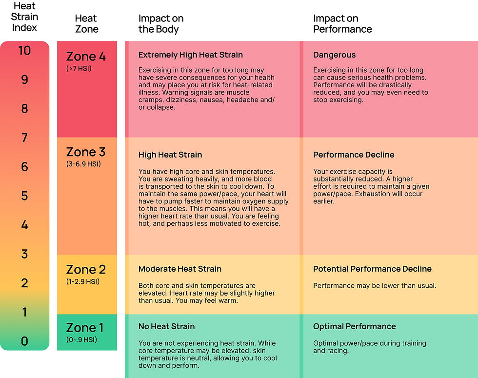 Research suggests that, as with regular training - you train, and the body responds by fixing-up stronger in case you train again - heat training prepares the body to cope better in heat (4). A heat stress index was first developed by Robert G. Steadman in 1979 to categorise atmospheric heat and its effects on the body, but not exercise-specific zones. More recently, a company called CORE developed heat index scoring for athletes (5).
